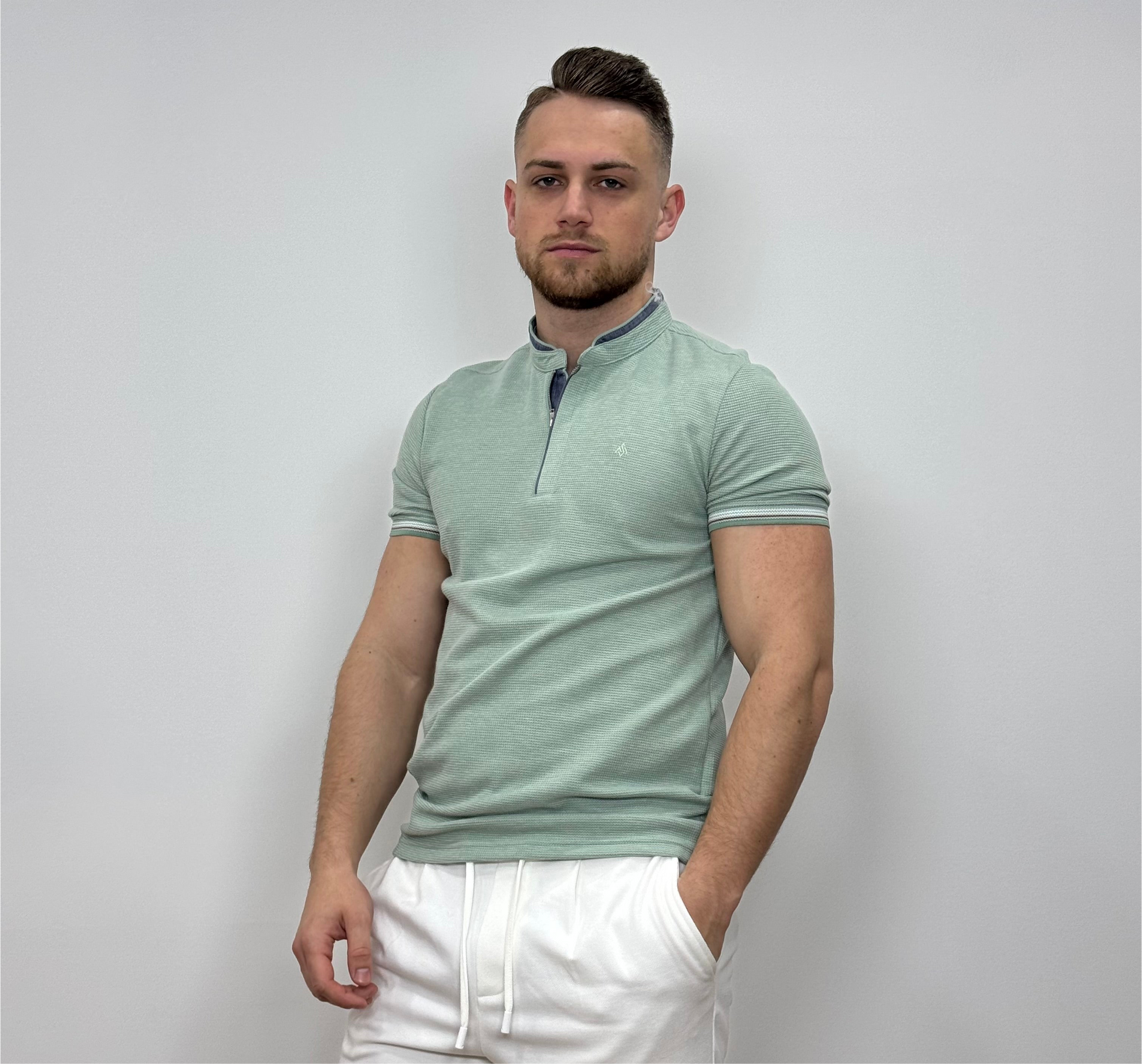 Különleges bordázott anyag, álló gallér, rövid cipzáros nyakrész, ujjak végén kontrasztos csíkozás, kényelmes viselet.